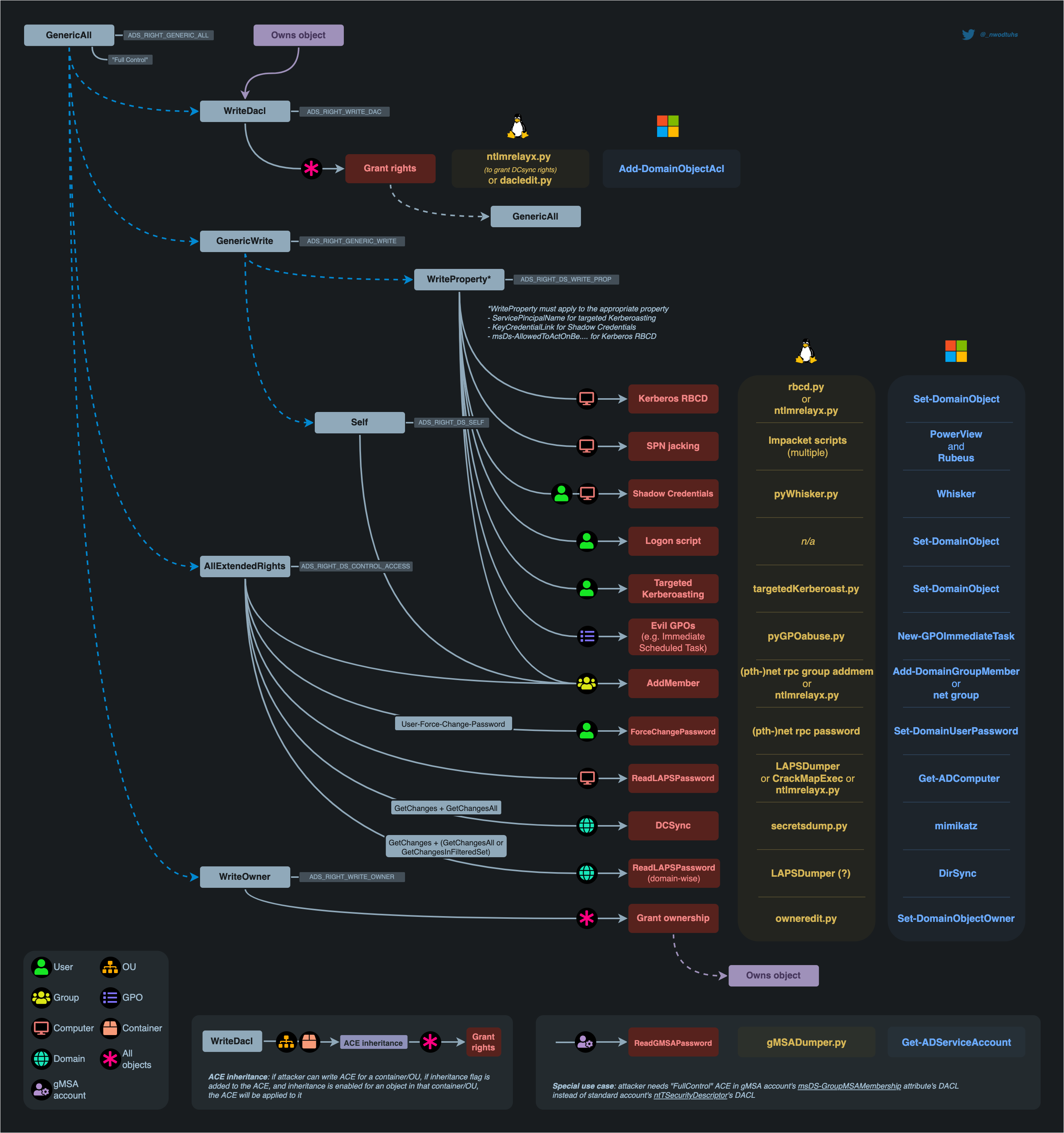 AddKeyCredentialLink, a write permission on an object'sKey-Credential-Linkattribute, for Shadow Credentials attacksWriteSPN, a write permission on an object'sService-Principal-Nameattribute, for targeted Kerberoasting and SPN jacking attacksAddSelf, similar toAddMember. WhileAddMemberisWritePropertyaccess right on the target'sMemberattribute,AddSelfis aSelfaccess right on the target'sMemberattribute, allowing the attacker to add itself to the target group, instead of adding arbitrary principals.AddAllowedToAct, a write permission on an object'smsDS-Allowed-To-Act-On-Behalf-Of-Other-Identityattribute, for Kerberos RBCD attacksSyncLAPSPassword, bothDS-GetChangesandDS-GetChangesInFilteredSet, for synchronizing LAPS password domain-wiseWriteAccountRestrictions, which refers to theUser-Account-Restrictionsproperty set, which contains enough permissions to modify themsDS-Allowed-To-Act-On-Behalf-Of-Other-Identityattribute of the target objects, for Kerberos RBCD attacks