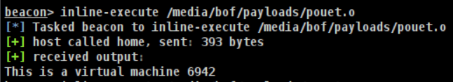 Here is an example of how to launch the BoF (Beacon Object File) once compiled. The source code is available here and the goal is to verify if we are dealing with a virtual machine or not.